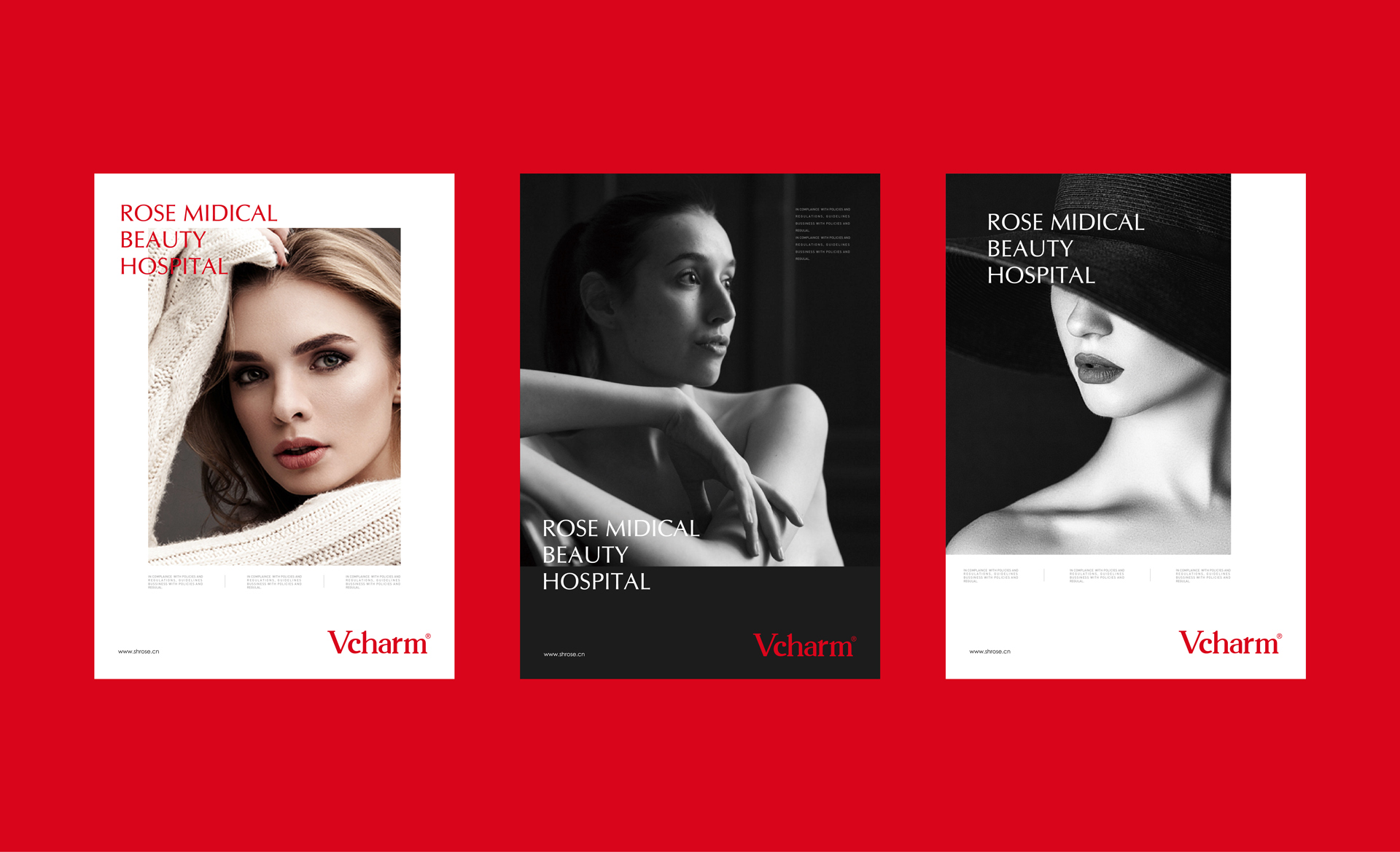 依據對美容整型產品行業的經驗和分析,和與德為Vcharm品牌定制品牌專屬色:玫瑰紅,使得品牌在行業內有一個很好的占位。其logo的設計典雅高貴,使品牌更加有包容性,為未來品牌整合做鋪墊。