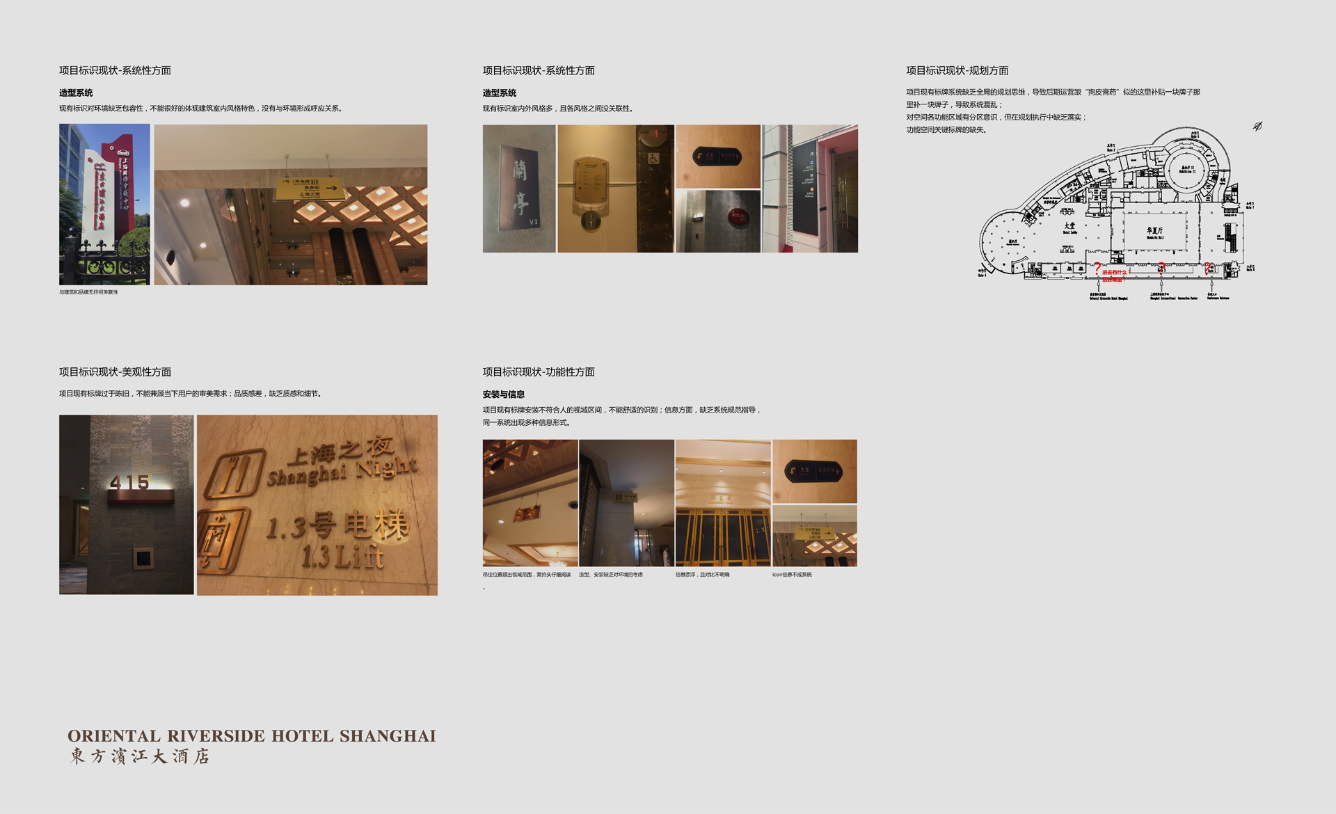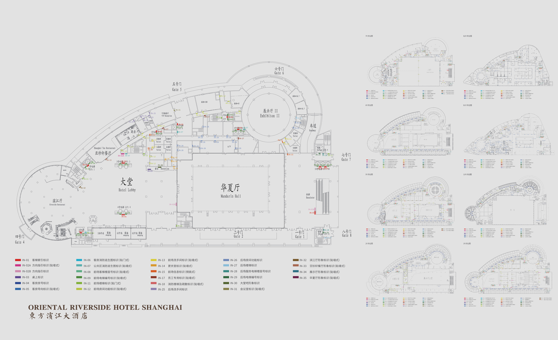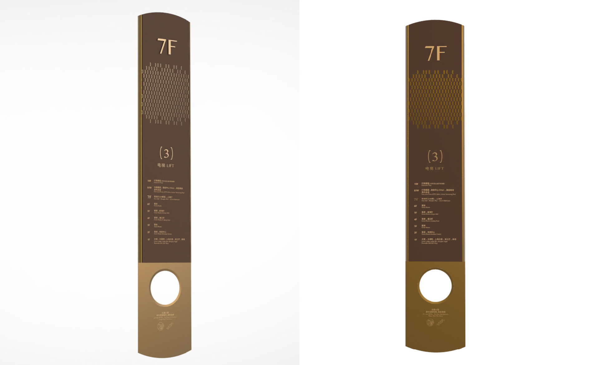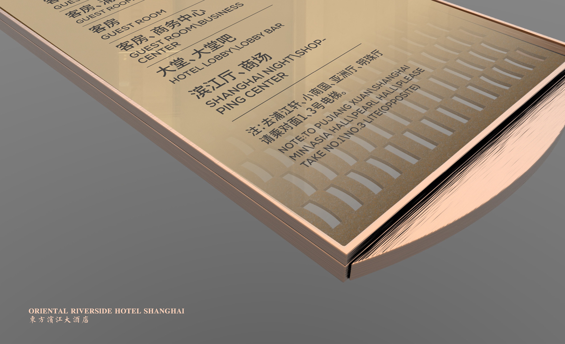 原有導(dǎo)視系統(tǒng)在視覺層面和功能層面存在的缺少系統(tǒng)性、美觀性及全局性的問題,不但影響了客戶日常運(yùn)營管理工作,而且影響了其所接待的客人對其整體形象的認(rèn)可度。和與德在充分了解其需求后,提出了相應(yīng)的導(dǎo)視系統(tǒng)提升建議及方案,視覺層面?zhèn)戎乜紤]上海國際會(huì)議中心獨(dú)有的建筑環(huán)境空間特色,結(jié)合聚、散、流,從LOGO中演化輔助圖形,并通過漸變等工藝建議,以凸顯其品質(zhì)感;功能層面?zhèn)戎貜母鳂菍又械墓δ懿季旨案鞣謪^(qū)的關(guān)聯(lián)性出發(fā),系統(tǒng)性地進(jìn)行規(guī)劃布點(diǎn),力求實(shí)現(xiàn)不同人群的導(dǎo)向需求。
